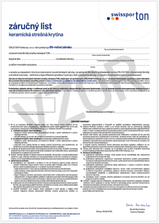 Ak chcete získať rozšírenú záruku - 50 rokov na keramické škridly swissporTON a 30 rokov na cementové škridly swissporTON alebo keramické škridly CREATON – zaregistrujte svoju Záručnú kartu online.